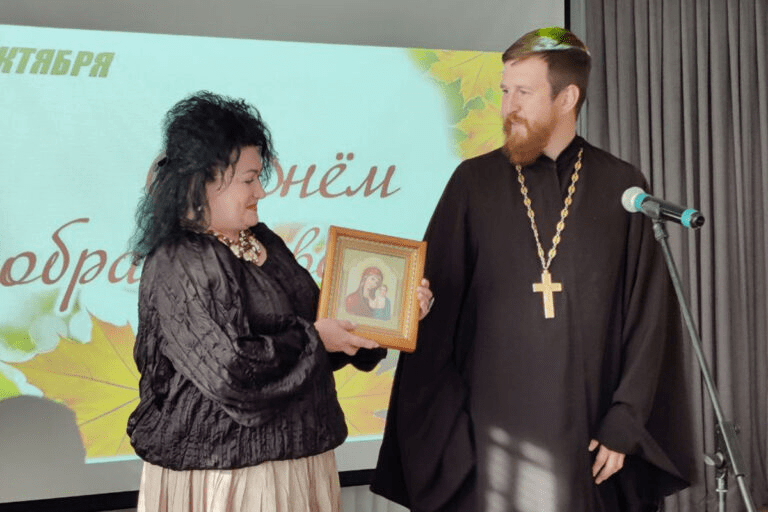 Благочинный Жодинского церковного округа Сергий Чукович пожелал всем крепкого здоровья и молодости в душе и вручил директору ЖТЦСОН Татьяне Комар икону Божьей Матери.