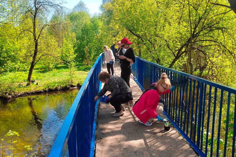 Пока мужчина работали бензопилами и электрокосами, женщины покрасили перила моста, которым постоянно пользуются местные жители.