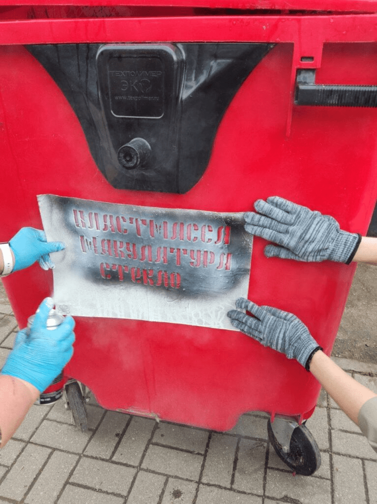 Работники ЖКХ обновляют надписи на контейнерах для раздельного сбора мусора. Пластмасса, макулатура, стекло – все это должно отправляться в красный контейнер.