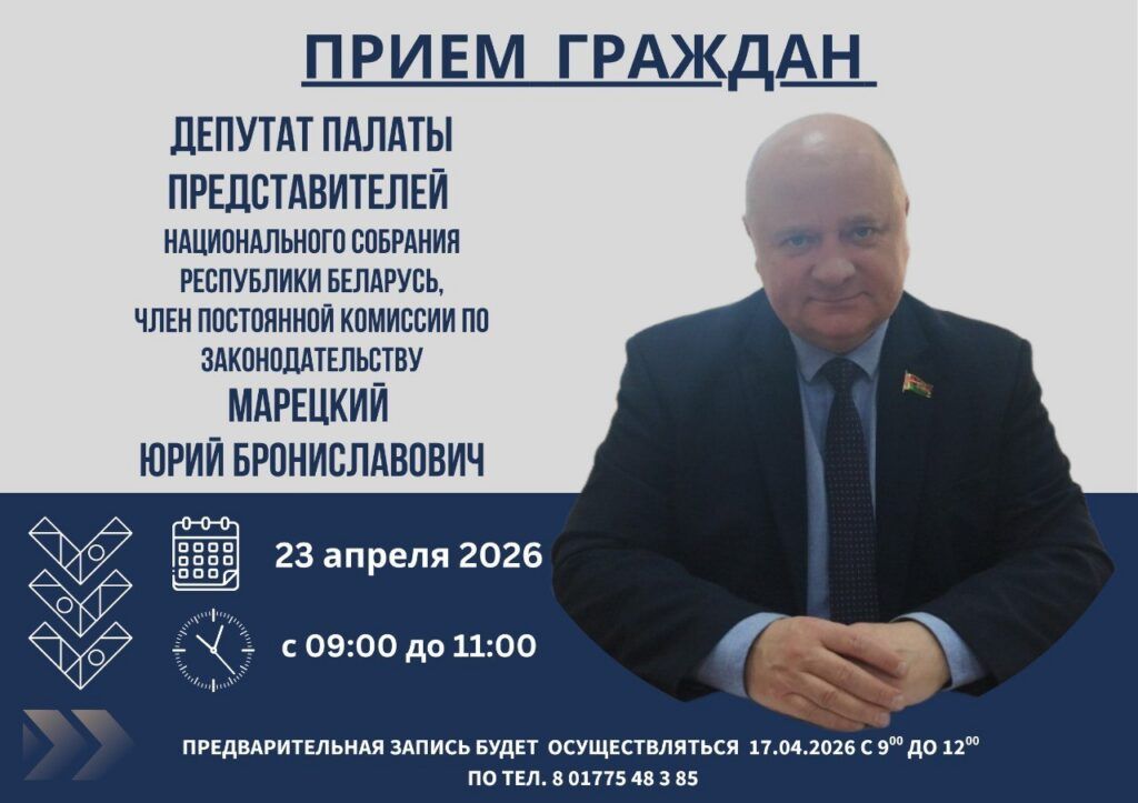 23 апреля с 9.00 до 11.00 депутат Палаты представителей Национального собрания Республики Беларусь, член Постоянной комиссии по законодательству МАРЕЦКИЙ ЮРИЙ БРОНИСЛАВОВИЧ проведет прием граждан и представителей юридических лиц.