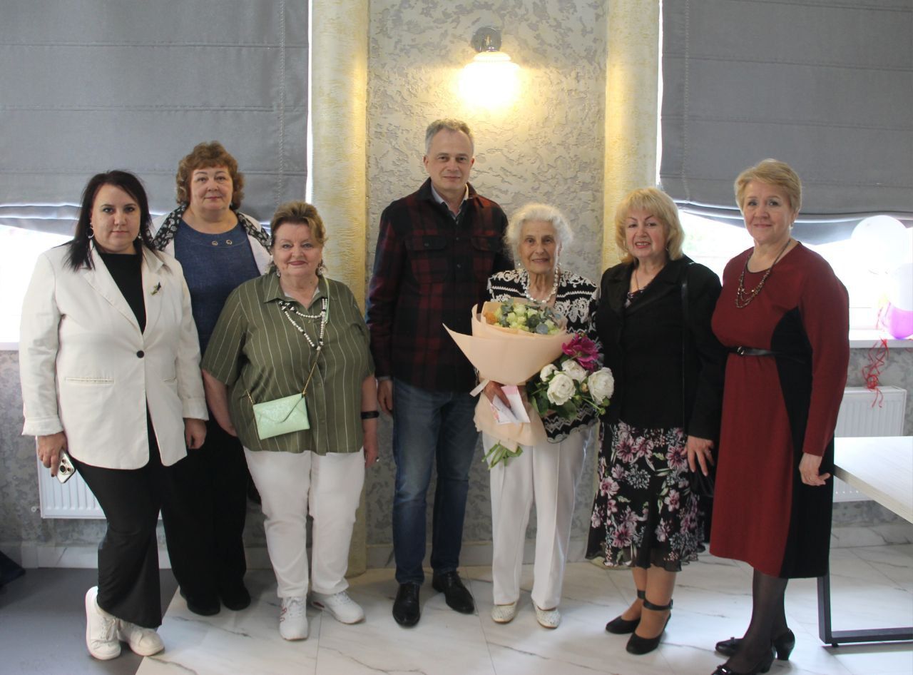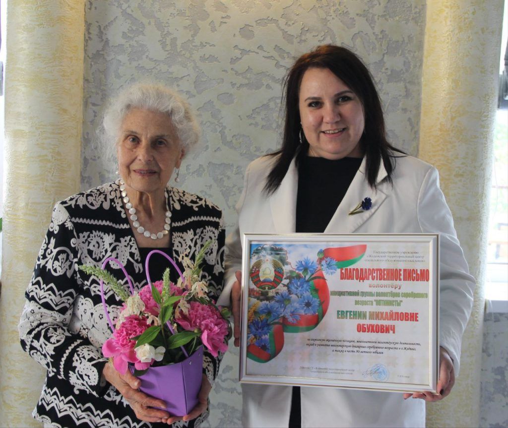 Евгению Михайловну пришли поздравить председатель Совета ветеранов Татьяна Навроцкая, председатель Жодинской городской организации Белорусского Общества Красного Креста Марина Ус и заведующая отделением дневного пребывания для граждан пожилого возраста Анастасия Заремба.
