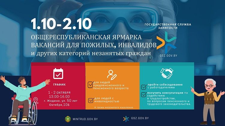 1-2 октября 2025 года с 13.00 до 16.00 на базе Филиала «Молодежный центр г. Жодино» (ул. 50 лет Октября, 10Б) будет проводиться «Серебряная ярмарка вакансий». Приглашаем граждан пенсионного и предпенсионного возраста, инвалидов и других категорий незанятых граждан принять участие в мероприятии. Телефон для справок: 48572, 48890.