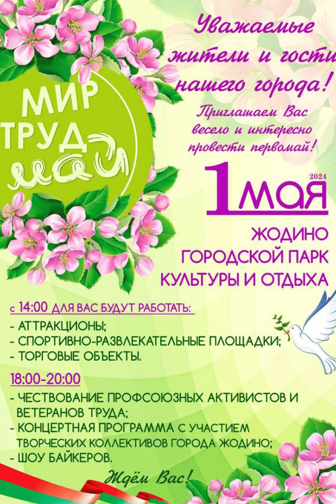 Этот праздник у всех ассоциируется с трудом и традициями. Так зачем же их нарушать? Тем более что в городском парке жодинцев ждет яркая программа: концерт, спортивные площадки и байкер-шоу. Приходите, будет интересно и празднично!