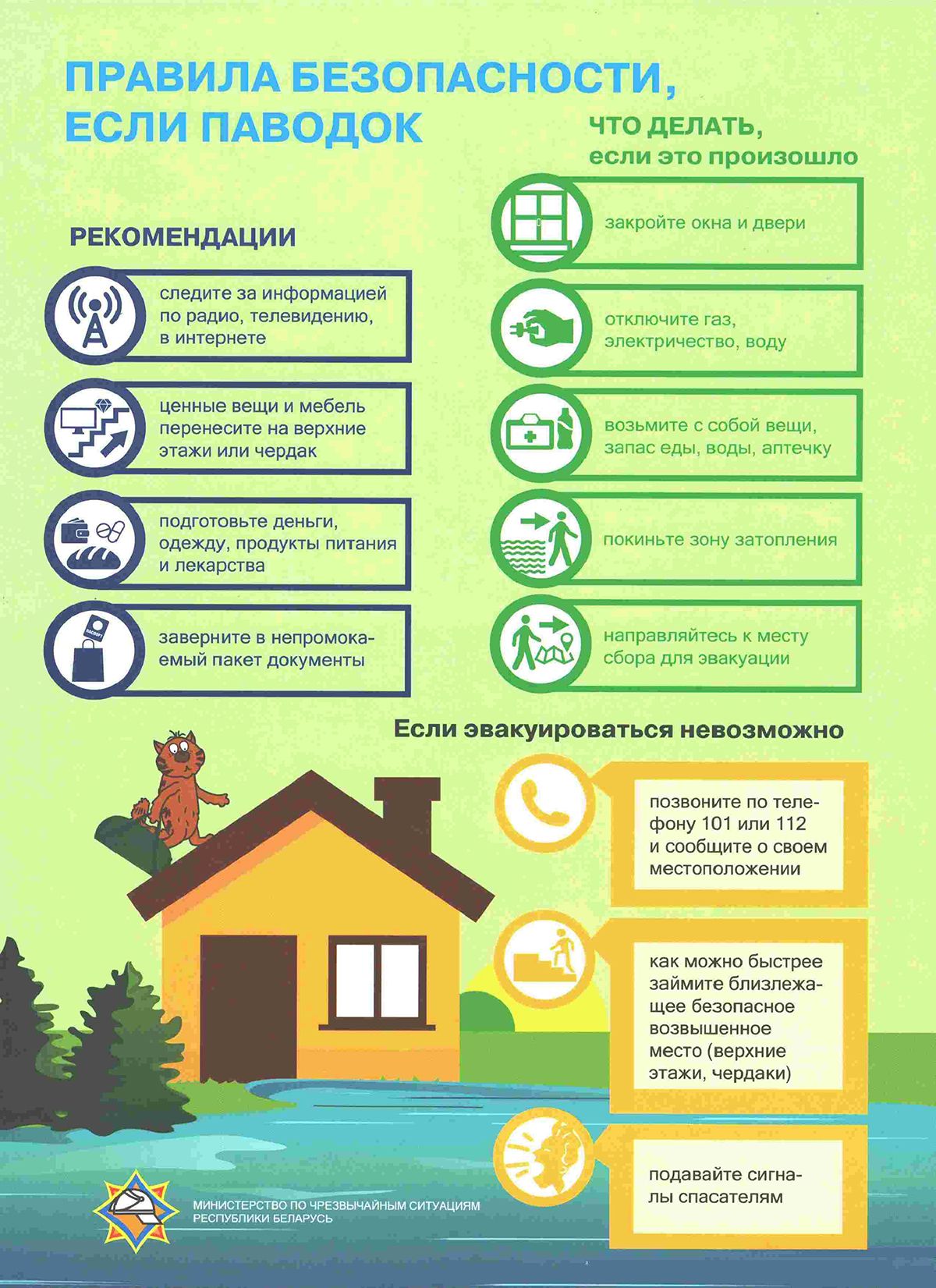 В любой чрезвычайной ситуации очень важно сохранять спокойствие и не паниковать. Держите рядом «тревожный чемоданчик» или самые необходимые вещи в целлофановом пакете, по возможности быстрее уходите из зоны затопления. Если такой возможности нет, то поднимитесь как можно выше, на верхние этажи. Если дом одноэтажный, то постарайтесь выбраться на чердак. Сигнализируйте спасателям, чтобы они могли вас заметить.
